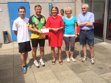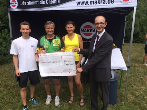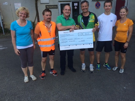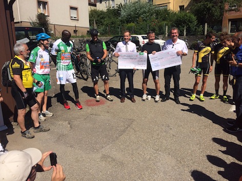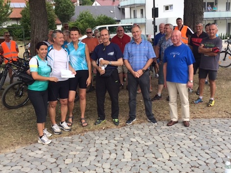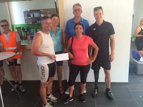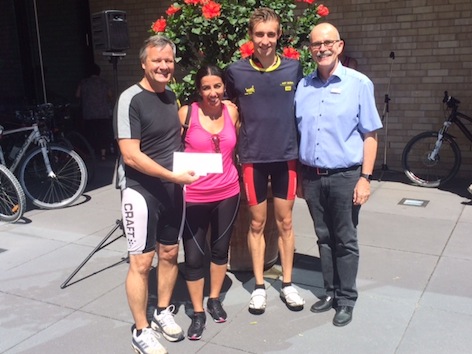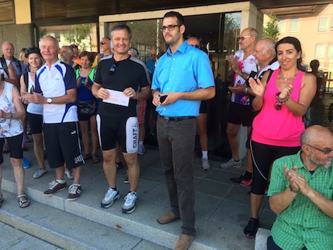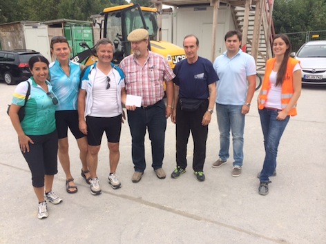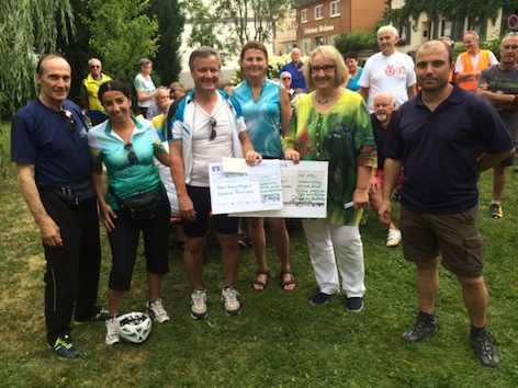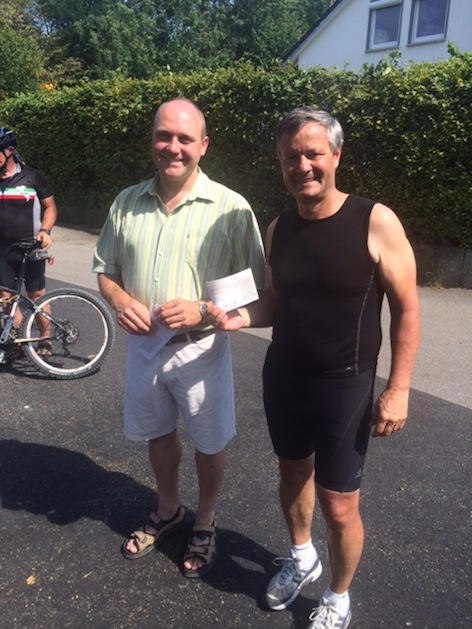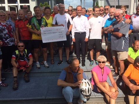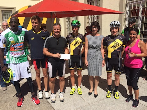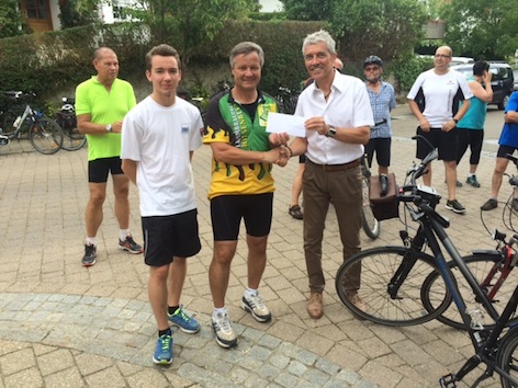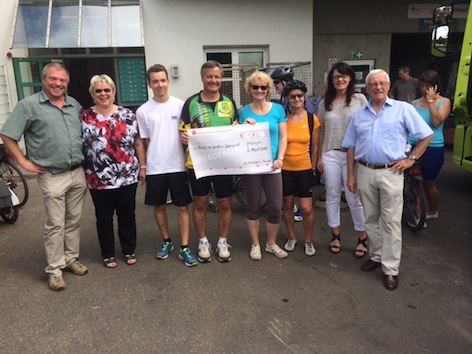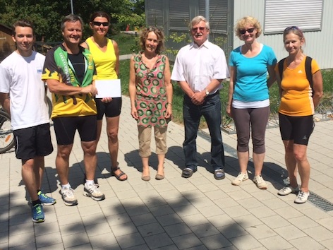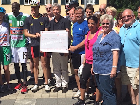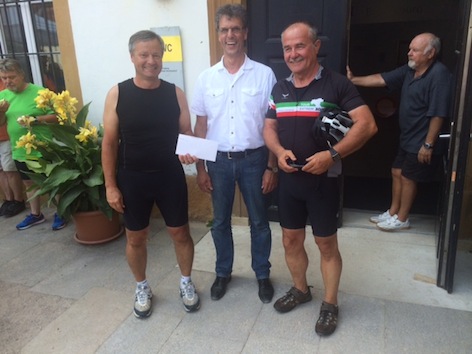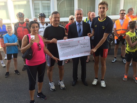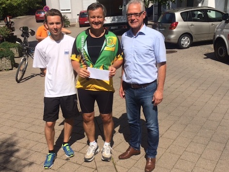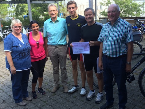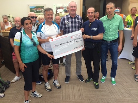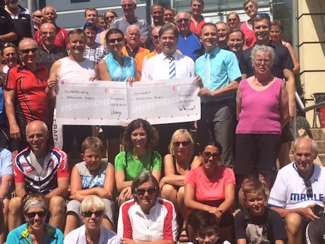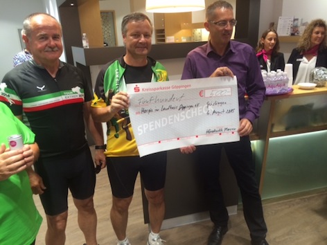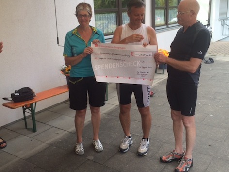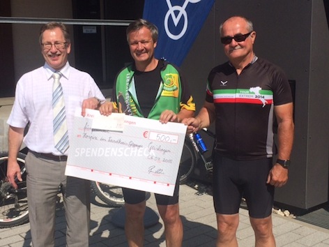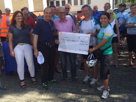 Claudia Pracht und Gerhard Veit übergeben Klaus Riegert die Spende der teilgenommenen Radler