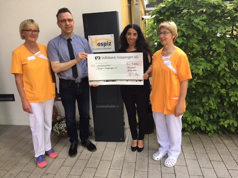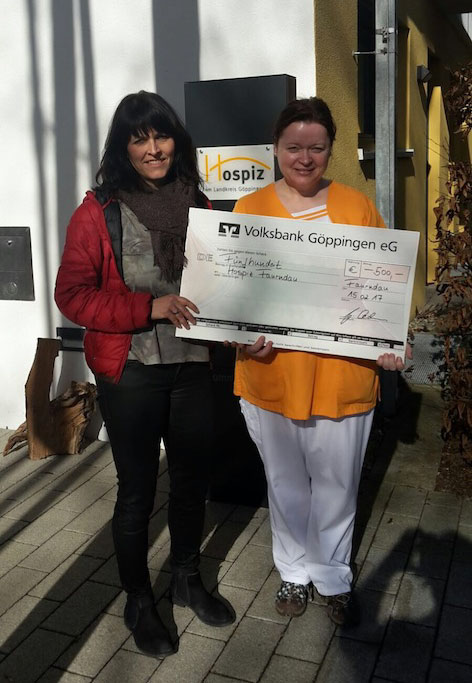 16.03.2017 - Herzlichen Dank an die NWZ-Gute Taten Die „Gute Taten“ der NWZ-Weihnachtsaktion bedenkt schon seit vielen Jahren das stationäre Hospiz in Faurndau. Die NWZ war behilflich bei der Baufinanzierung, gab anschließend Zuwendungen in der Startphase des Hospizes, sowie in den letzten Jahren Spenden für die FSJ-Stelle, für die Supervision der Ehrenamtlichen im stationären Hospiz und in diesem Jahr einen Scheck über 10.000 € für die sehr teuren Fortbildungsmaßnahmen für zwei Schwestern in der Schmerztherapie und in der Psychoonkologie. Vorsitzender Klaus Riegert nahm ihn bei der Abschlussveranstaltung entgegen. Herzlichen Dank an die NWZ-Verantwortlichen und den Leserinnen und Leser mit ihrer großzügigen Spendenbereitschaft. 14.02.2017 – Ottenbacher Landfrauen spenden an Hospiz Die Ottenbacher Landfrauen um Lore Frey und Gerda Wahl überwiesen unserem Hospiz 600 €. Davon stammen 540 € aus dem Theaterwochenende bei dem die Landfrauen die Besucher mit Essen und Trinken verwöhnten. Die Tischdekoration die ebenfalls die Gruppe um Lore Frey und Gerda Wahl kreierte, wurde im Anschluss gegen eine Spende an die Besucher abgegeben. Den Rest stockten die Landfrauen großzügig aus der eigenen Kasse auf. 16.02.2017 – Elektro Weidenbach aus Adelberg spendet 500 €