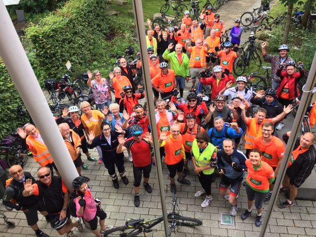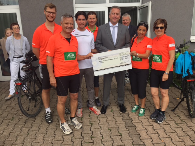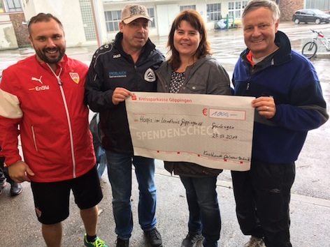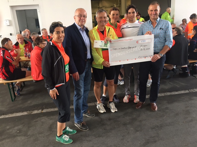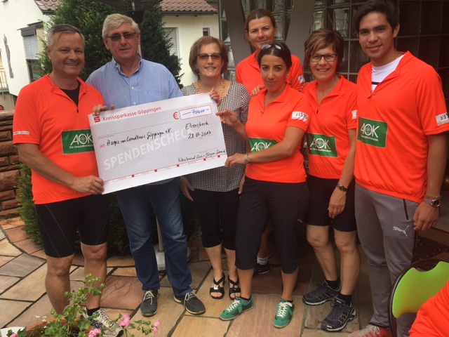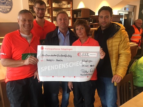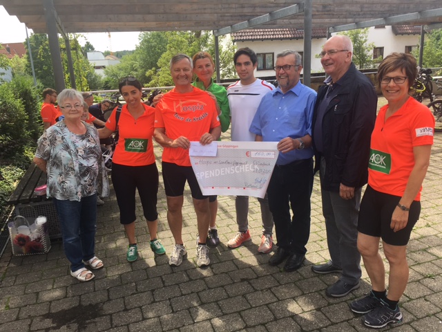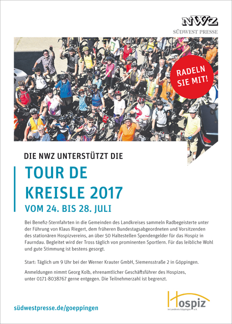 15.07.2017 – NWZ-Unterstützungsanzeige zum Auftakt Tour de Kreisle 15. „Tour de Kreisle“ vom 24. – 28. Juli 2017 Liebe Mitbürgerinnen und Mitbürger, zum 15. Mal startet die „Tour de Kreis“ zu Gunsten des stationären Hospizes in Göppingen-Faurndau. Mit vielen Radlern bin ich wieder vom 24. bis 28. Juli im Landkreis Göppingen unterwegs. Rund 50-mal machen wir halt in Städten und Gemeinden, bei Spendern und Sponsoren und hoffen, für den Betrieb unseres stationären Hospizes einiges an Geld einzufahren. Wir machen dies sehr gerne, weil wir immer mit großer Begeisterung und großzügigen Spenden empfangen worden sind. Wäre schön, wenn es auch dieses Jahr wieder so wäre. Täglich starten wir bei der Fa. Werner Krauter in der Siemensstraße in Göppingen. Dort beginnt morgens um 09:00 h die Sternfahrt und endet dort auch abends (Fahrräder können bei der Firma Krauter über Nacht eingestellt werden). Nahezu alle Gemeinden mit ihren Oberbürgermeistern, Bürgermeisterinnen und Bürgermeistern unterstützen unsere Benefizaktion. Ganz besonders dankbar sind wir der NWZ und der AOK, die seit Jahren tolle und verlässlicher Partner unserer Spendenaktion sind. Mitfahren kann jeder! Bereits angemeldet haben sich rund 40 Radlerinnen und Radler jeden Alters. Maximal mitfahren können 50-60 Teilnehmer. Begleitet wird der Tross täglich abwechselnd von prominenten Sportlern: Mit dabei sind Handballerin der Frisch Auf Bundesliga Mannschaft, die jahrzehntelange „Legende am Reck“, Eberhard Gienger; Jugendfechtweltmeister Florian Lehnert und Deutschland Pokal Gewinner im Herren Säbel, der Mexikaner Gibran Zea Armenta; der ehemalige Spieler vom FC Donzdort und VFB Steffen Handschuh und der bisher erfolgreichste Teilnehmer der Paralympics mit 22 Medaillen, Rennskifahrer Gerd Schönfelder. Für medizinische Notfälle sind Einsatzsanitäter des Malteser Hilfsdienstes dabei und für alle Fälle gibt es einen „Besenwagen“ für Radler und Fahrräder. Wer sich der Tour die ganze Woche oder auch nur einen Tag anschließen möchte, kann dies gerne noch tun. Anmeldungen nimmt unser ehrenamtlicher Geschäftsführer Georg Kolb unter Tel. 0171-8038767 entgegen. Gerne können Sie uns auch an einem unserer Stopps besuchen, die Zeiten entnehmen Sie bitte dem folgenden Tourenplan. Bei Fragen während der Tour ist wiederum Georg Kolb unter Tel. 0171-8038767 Ihr Ansprechpartner. Schauen Sie doch vorbei. Über eine Spende, die Sie persönlich überreichen können, würden wir uns sehr freuen. Infomaterial über das Hospiz und auch spezielle Spenden-Couverts gibt es an den Haltestellen und auf Ihrem Rathaus. Es grüßt Sie herzlich Klaus Riegert mit dem Hospizteam Vorjahre (Archiv): 2022 · 2021 · 2020 · 2019 · 2018 · 2017 · 2016 · 2015 · 2014 Telefon: (07161) 98619-10 - info@hospiz-goeppingen.de |